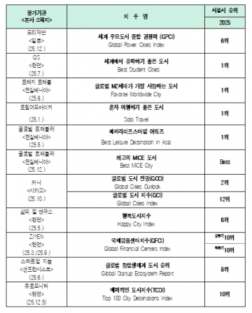 또 서울은 지난해 영국 런던에 본부를 둔 ‘삶의 질 연구소(Institute for Quality of Life)’가 발표한 ‘2025 세계에서 가장 행복한 도시’ 평가에서 200개 도시 중 시민 및 거버넌스 분야에서 높은 점수를 받으며 세계 ‘6위’ 도시에 올랐다.