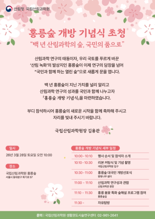 이번 행사는 대한민국 산림과학 연구의 요람이자 100년 역사를 품은 연구시험림인 홍릉숲이 국민과 함께하는 공간으로 거듭나는 새로운 출발을 기념하기 위해 마련됐다. 국립산림과학원은 이번 개방에 맞춰, 숲의 생태적·학술적 가치를 상징하는 ‘홍릉 8경’을 선정해 시민들에게 처음 공개한다.