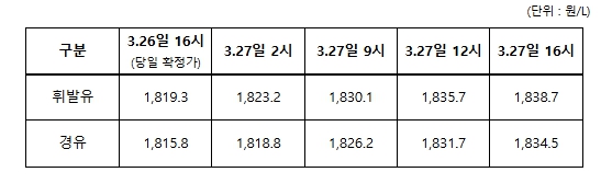 3월 27일 16시 기준 석유공사 유가정보시스템(오피넷) 가격 동향과 에너지·석유시장감시단 분석 결과에 따르면, 2차 최고가격 시행 전일인 3.26일 대비 가격 인상을 한 주유소는 전체 10,646개의 약 35%인 3,674개로 조사됐으며, 약 13%인 1,366개 주유소는 리터당 60원 이상 가격을 급격하게 인상한 것으로 나타났다. 전체 주유소 평균가격 기준으로는 전일 대비 휘발유, 경유 모두 리터당 약 19원 정도 주유소 가격이 인상됐다.